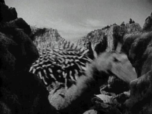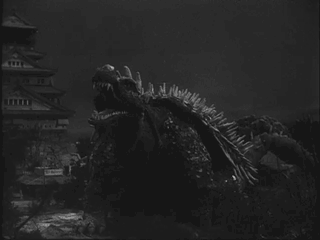 Hilariously, the flares that were supposed to lure Godzilla AWAY from Osaka, lure our boy Anguirus INTO the city. Tsubaraya and Watanabe’s new costumes allowed the actors a wider range of motion, and didn’t cause them to pass out of heat strokes after three minutes. In order to show off the new suits, larger and more intricate sets were built, just to be destroyed in the filming process, including a recreation of Osaka Castle. As the monsters shake the earth beneath it and crash into its sides, they use a cute effect of animating cracks over the model before its ultimate collapse. The radio man calling the news describes Godzilla as “THE BASTARD-SPAWN OF THE HYDROGEN BOMB” during this bout and honestly that moniker kicks ass and should have been brought back in every subsequent movie.