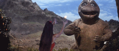 Minilla grows a bit the next time we see him and damn if he didn’t look like a stoned baby when he first hatched, he sure as hell does now. The rest of the movie is mostly cutesy scenes of Minilla learning from Godzilla and playing around like a toddler. In a lot of quality kids movies, the children have a certain juvenile cunning, living in their own world unique to the perspective of youth, and often pointing out the pitfalls and flaws of adulthood. Son of Godzilla is not that. It’s Caillou with kaiju. There are a couple of semi-endearing scenes though. Minilla is trying to blow radiation breath, but can only blow smoke rings. Godzilla shows him how, but Minilla overreacts to the loud noise and Godzilla comes close to smacking him one for being a coward. On the next attempt, Godzilla steps on his tail, and he’s humorously able to go full blast.