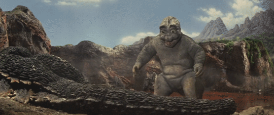 In the opening scene, the crew of a cargo plane picks up some interference that’s “like brainwaves” ….ok fine. Later, it looks like the source of the interference is this egg that a group of Kamacuras have found. Out hatches a baby Godzilla, in his round plump Thanksgiving turkey-lizard form. He’s nicknamed “Minilla” like a mini-Godzilla, and just about the most hideous little freak you’ve ever set eyes on. I know the theme of this film is anti-bullying, but at this point I’m almost rooting for the Kamacuras. I’m embellishing; it actually is sad when they’re poking at him. Wrestler “Little Man” Machan does do an athletic job with the task he’s given as the Minilla suit actor.