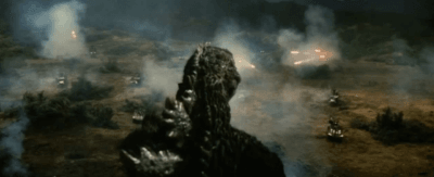 Tanks and rocket launchers ineffectively firing at Godzilla