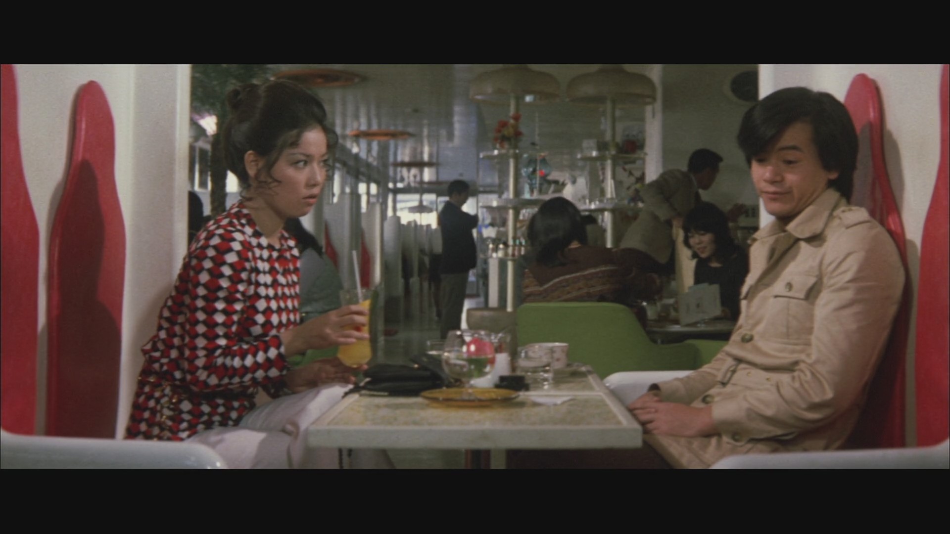 Gengo and his black-belt girlfriend Tomoko Tomoe, played by the fabulous Yuriko Hishimi, team up with Machiko Shima, the woman on the run, and her hippie friend Shosaku Takasugi played by Tomoko Umeda and Minoru Takashima respectively. We get two Tomoko’s for the price of one! The late 60s, early 70s fashion is on full display and I’m a little envious, they all look dope as hell! When they play the stolen tape, it’s a bunch of bloops and beeps, and apparently Godzilla and Anguirus can hear the transmission. And then…they discuss it! This is one of a few films where the monsters “talk” to each other, though it’s usually been roughly translated through the Shobijin or Minilla. In this one, there’s speech balloons with dialogue that seems so incongruous to the monsters it makes you feel like you’re having a stroke: