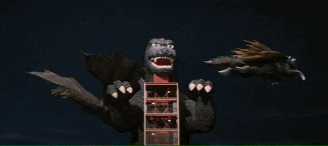 The actual new fight scenes are pretty cool, and Gigan’s design looks like a five year old described it: “So like, he’s got a cool red visor, and a beak, and hooks for hands, and and and dragon wings, and spikes, and scales, and a giant buzzsaw in his chest that actually spins! He tears a building apart with it and assaults Godzilla and it’s cool silly fun. Things take a dark turn when Gigan tears Godzilla and Kurosawa-esque fountain of blood shoots out! Its a serious geyser. It’s unfortunate that the movie becomes kind of a bore and so much stock footage is used because those shots rule. In addition to the reused scenes from earlier films, some new footage is looped back to back too in a fit of terrible editing. If they had spaced it out a little, and flipped the shot horizontally, it may have blended in a little more smoothly, but as it stands it’s extremely jarring seeing Gigan leap up and attack fighter jets five times in a row.