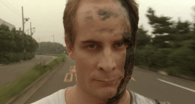 A small recon ship makes the trippy journey through time and buzzes past a US Battleship where two Americans who are ostensibly “acting” discuss hopes for the war’s end. All the Americans were played by people who the production team scooped up off of American military bases. The lines of dialogue are delightfully awful, including the response to seeing the recon ship blaze by. One sailor wonders if it could be aliens, and his commander’s like “No one would believe us, but you can tell your son about it when he’s born…….MAJOR SPIELBERG!” You can tell they’re both eating it up. The ship’s controls are also a blatant ripoff of the Back to the Future console, and when M-11 goes to scout the location, there’s this tremendously bad effect of him “running” super fast. There will be another “running” scene later that homage’s the T-1000 from Terminator 2, which should assuage anyone’s doubts of Ōmori’s love for American cinema.